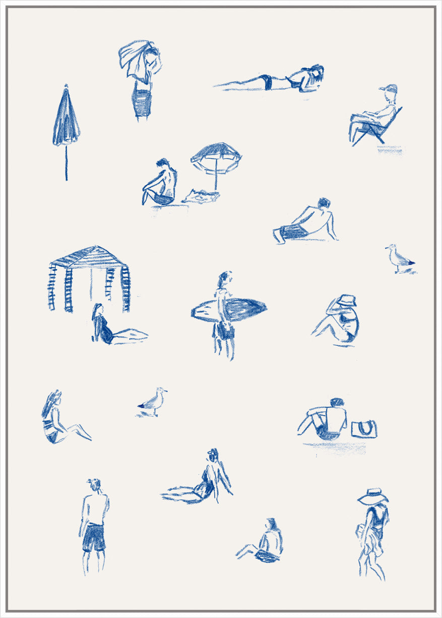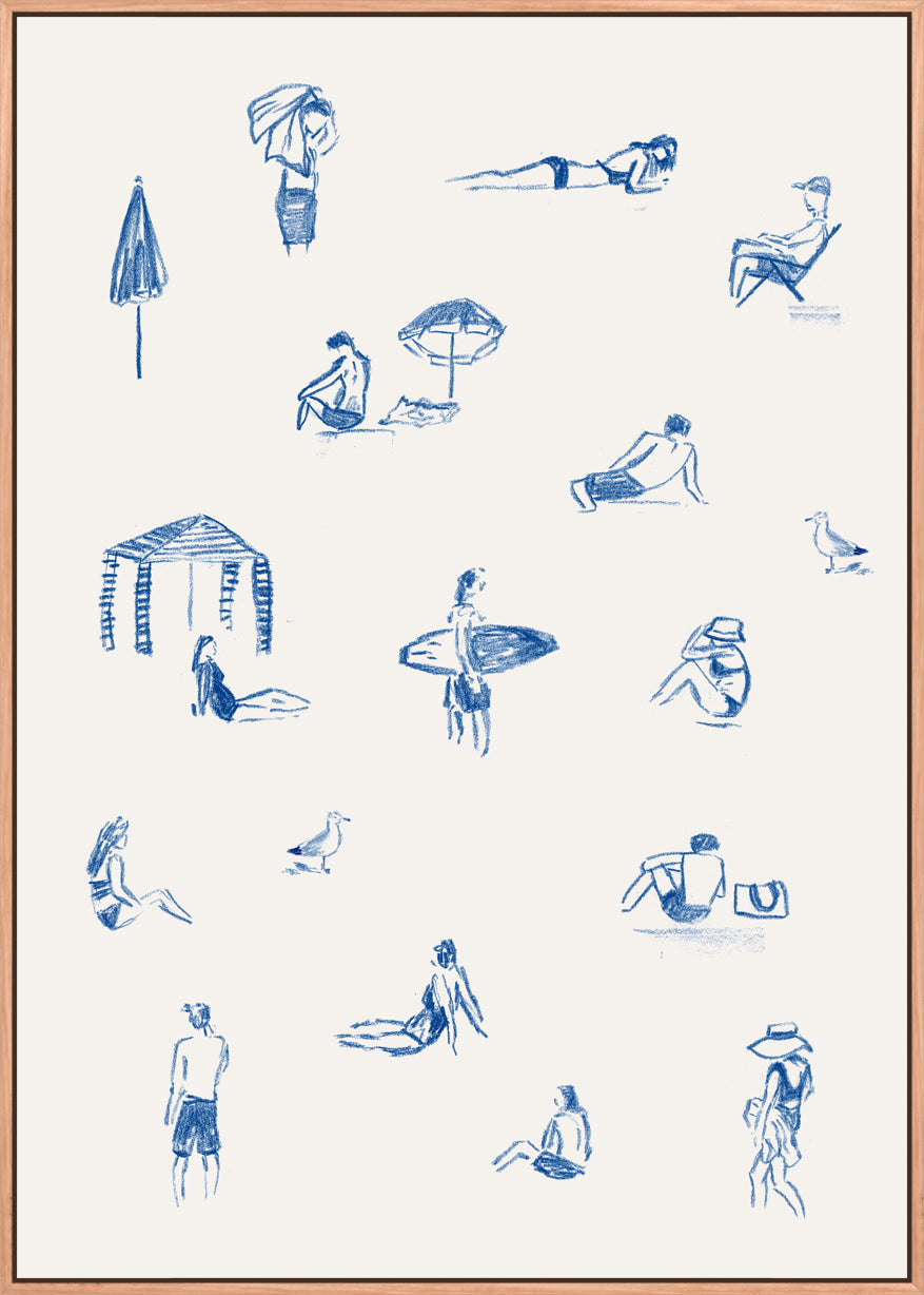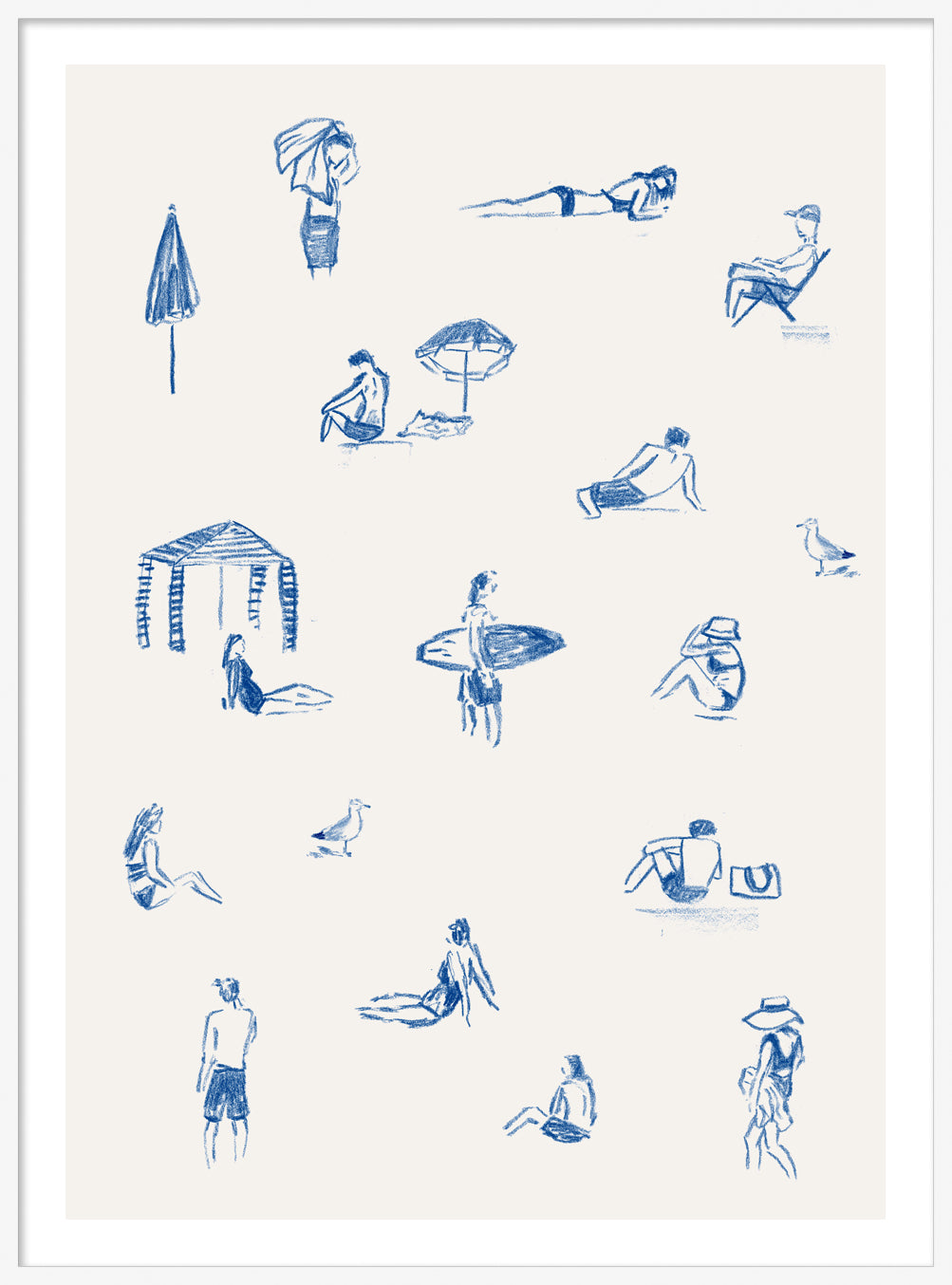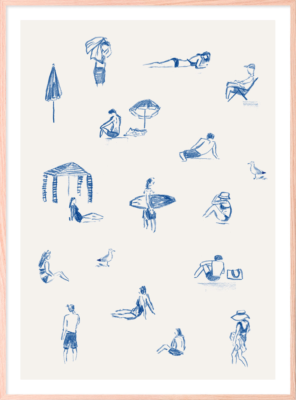 In beachy blue tones, this summer statement piece features hand drawn beach people in Cass's signature coastal style.