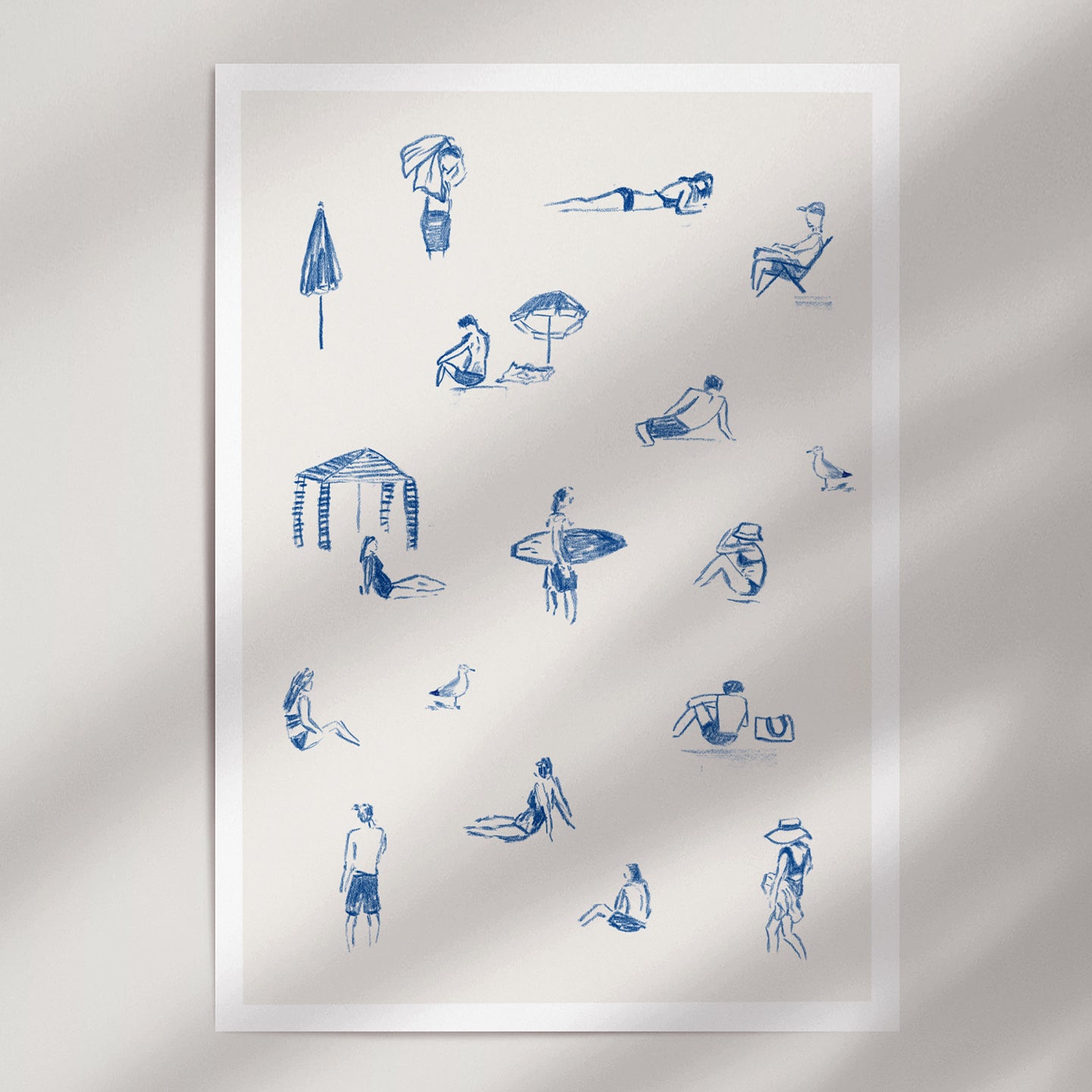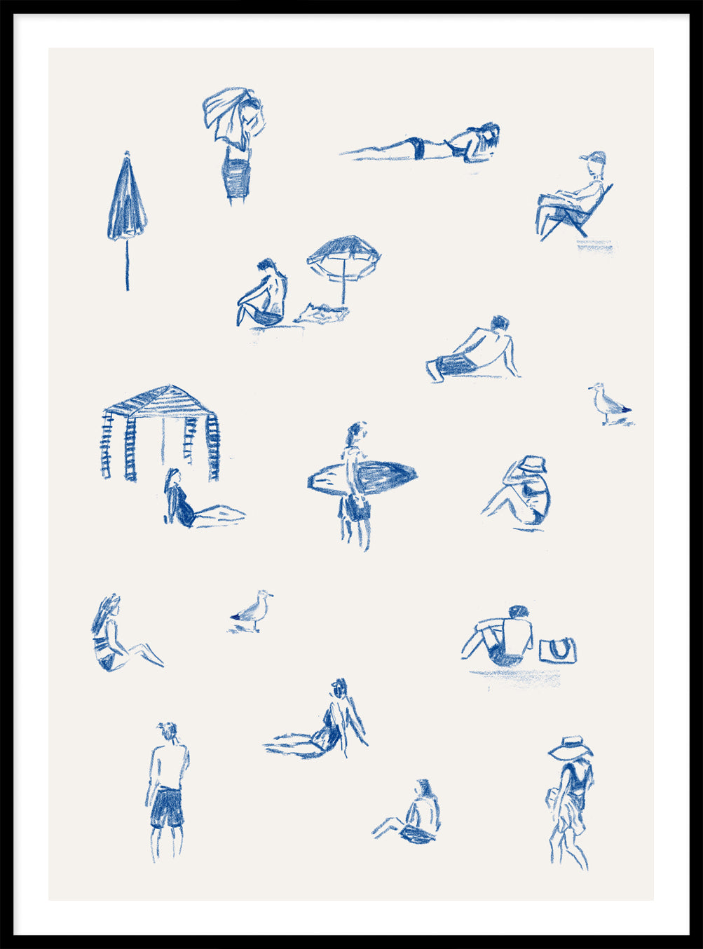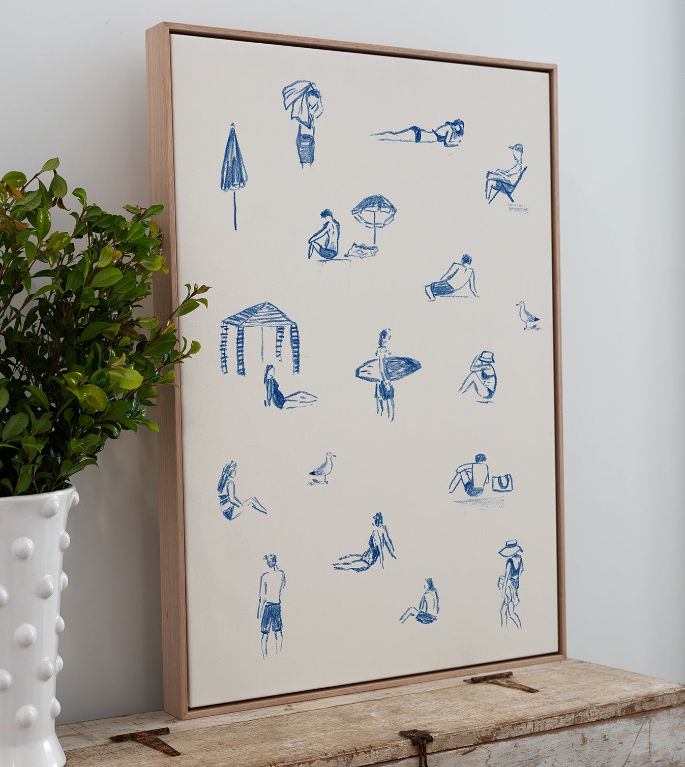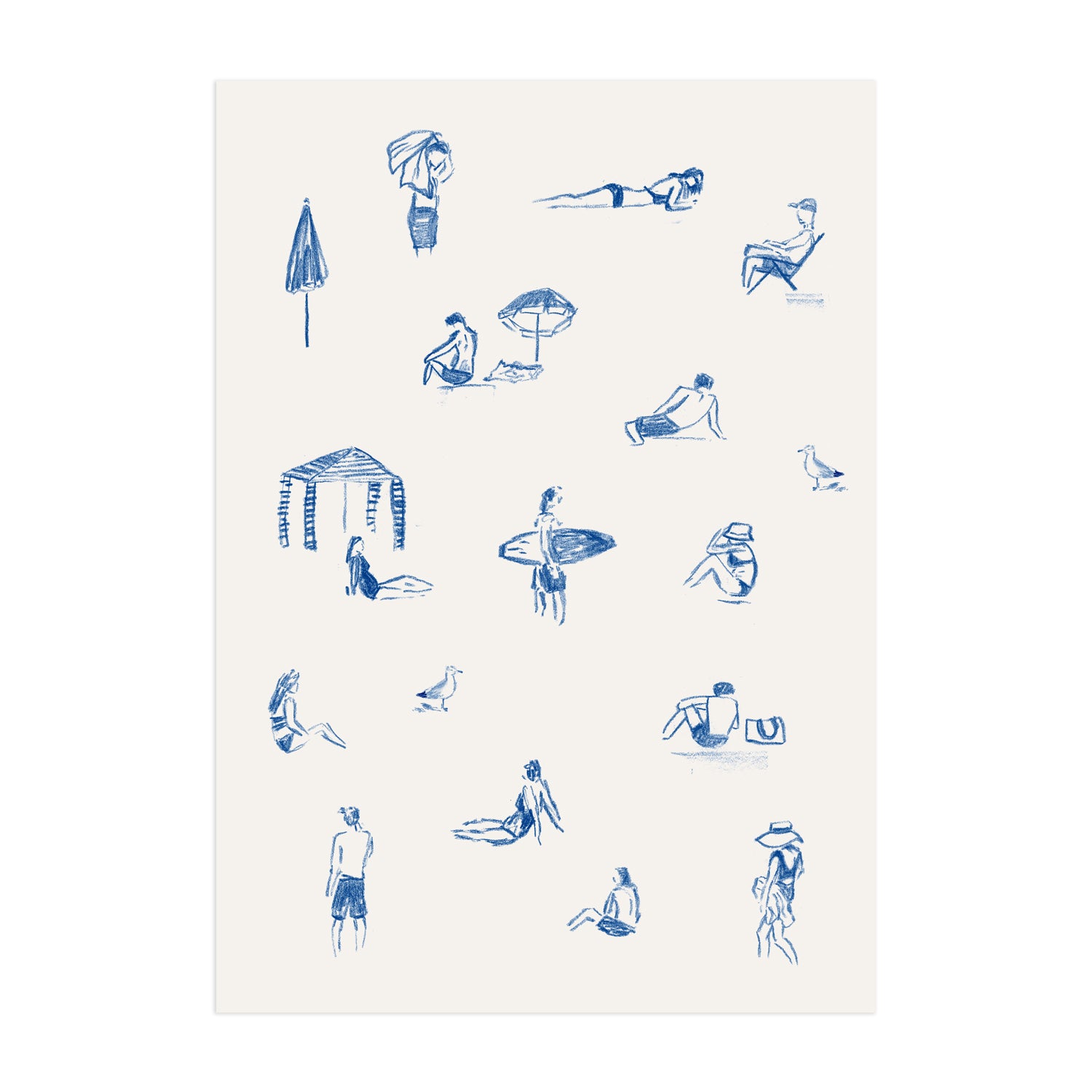 In beachy blue tones, this summer statement piece features hand drawn beach people in Cass's signature coastal style.