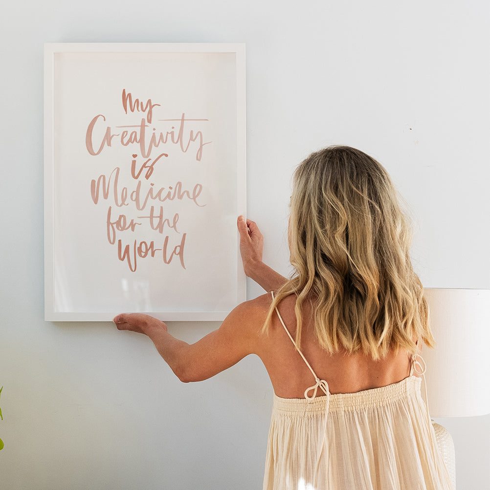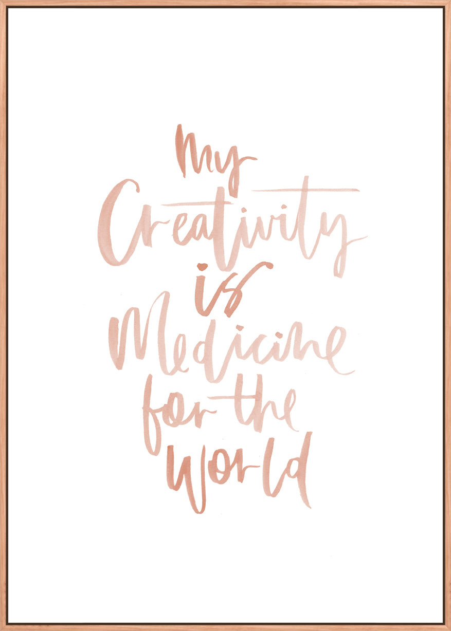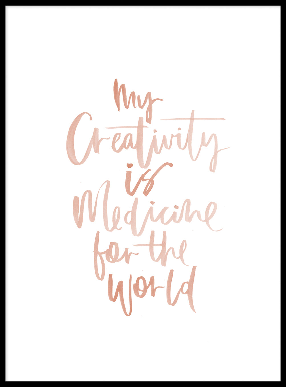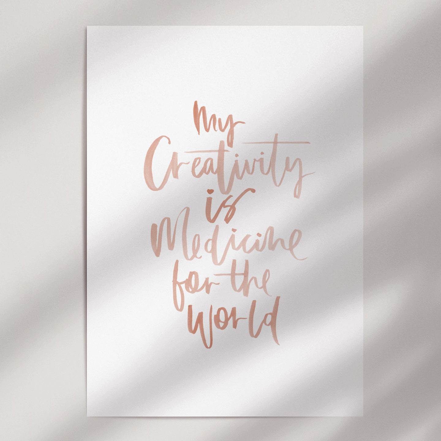 In stunning blue tones, this beautiful hand-lettered piece is a reminder to all creatives that their unique gifts are medicine for this world. Keep shining your light.