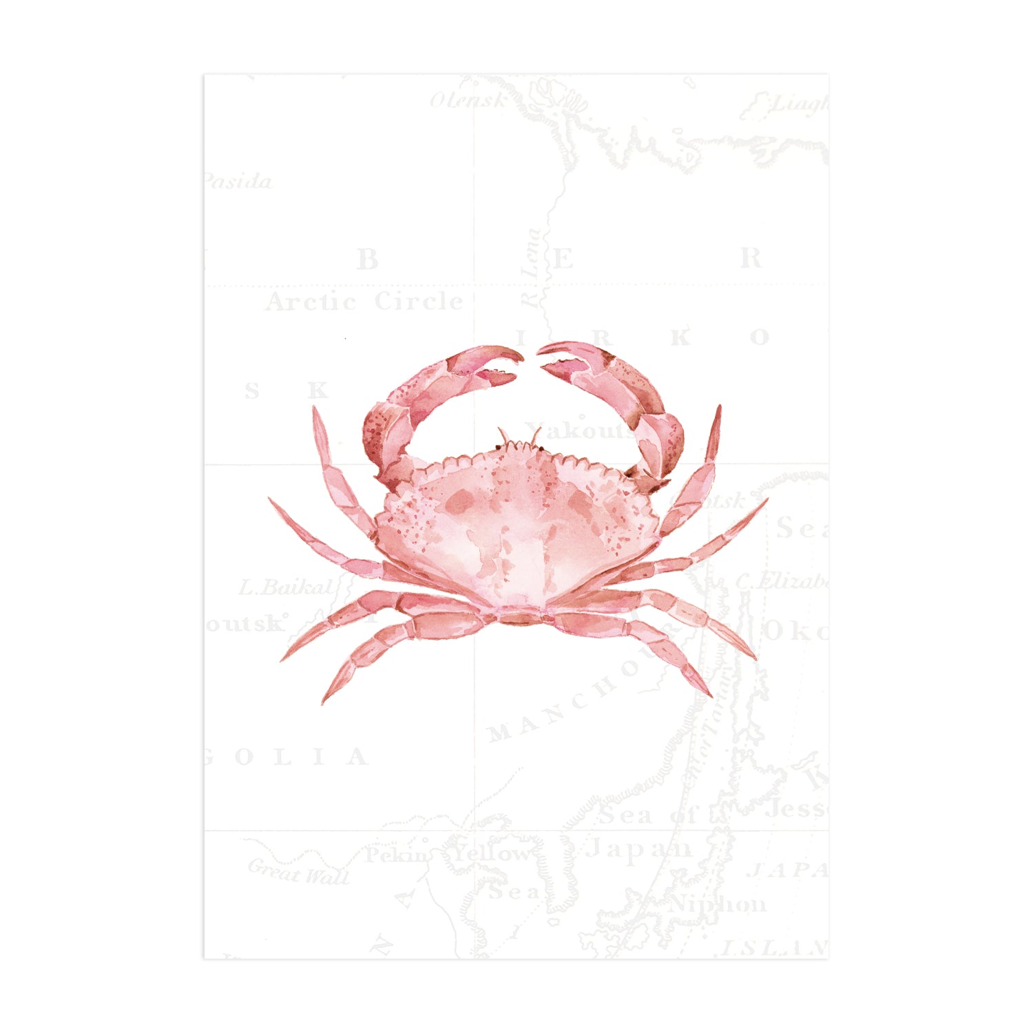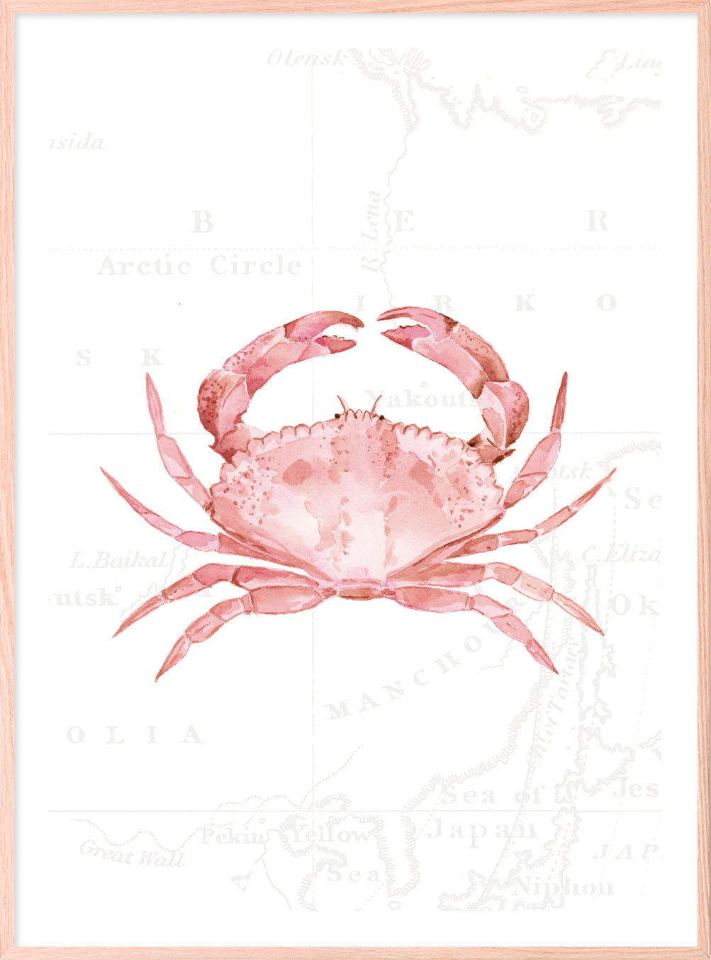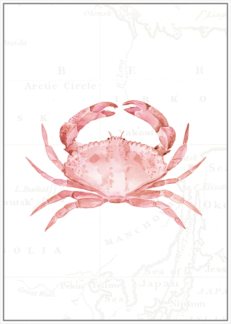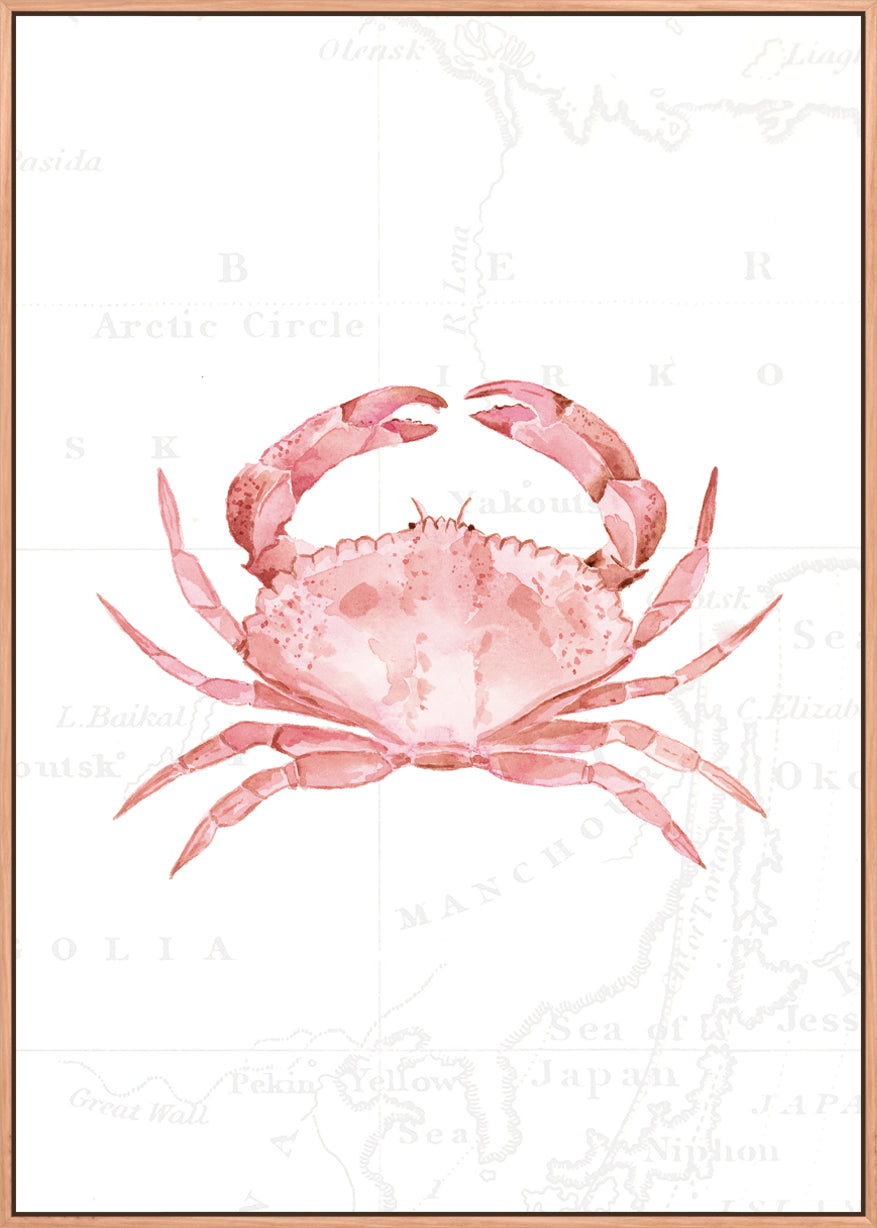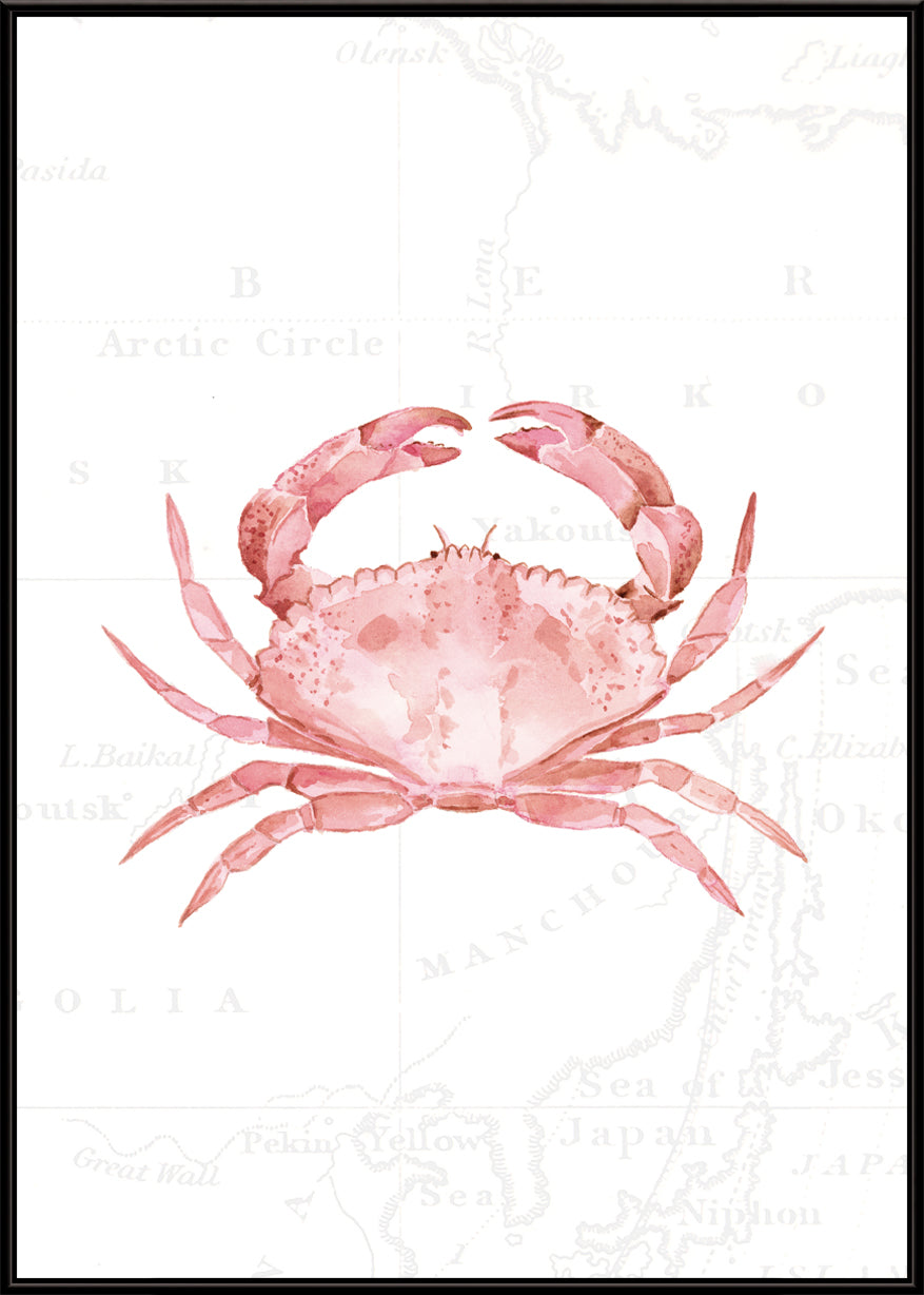 For the daydreamers and shoreline explorers - this gorgeous piece depicts a pink crab, hand painted in delicate watercolours against soft vintage map detailing.