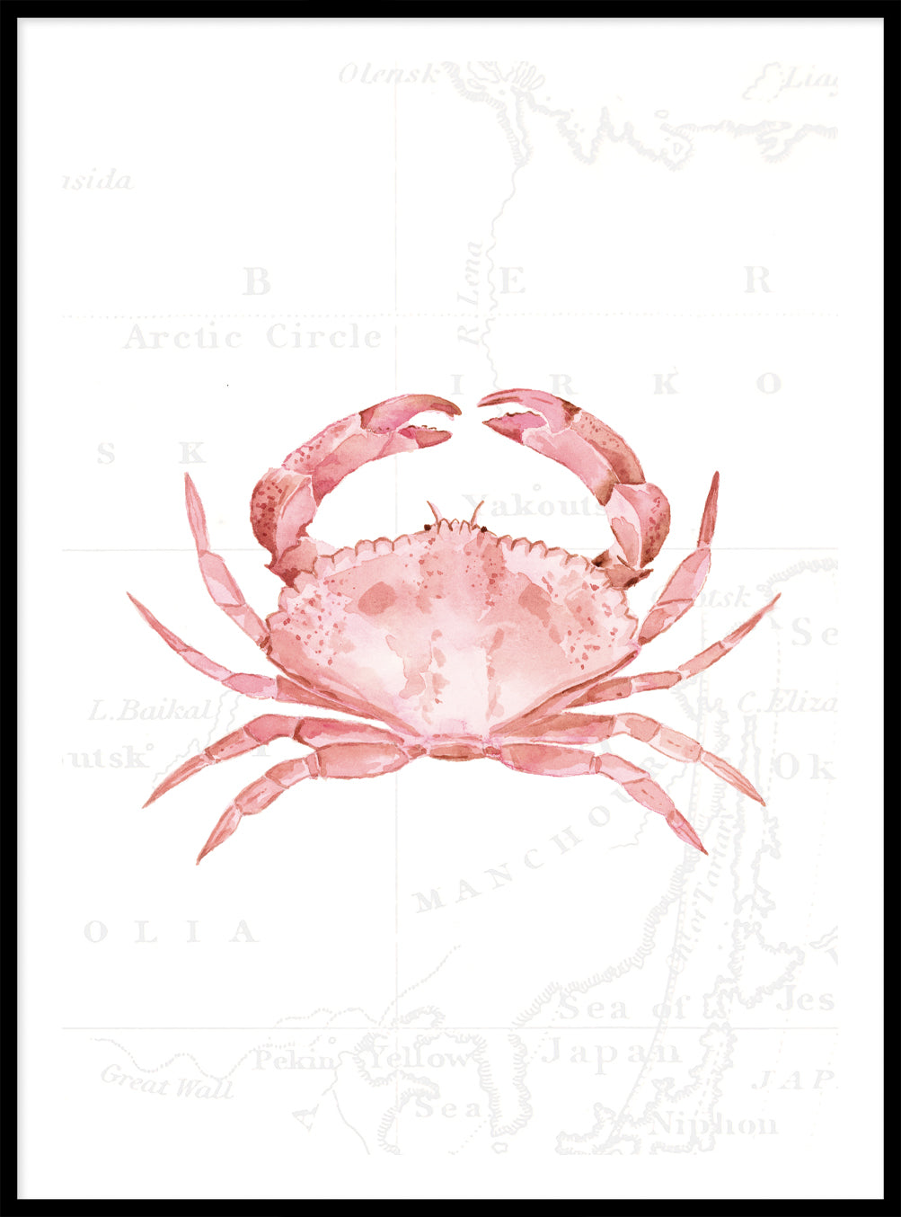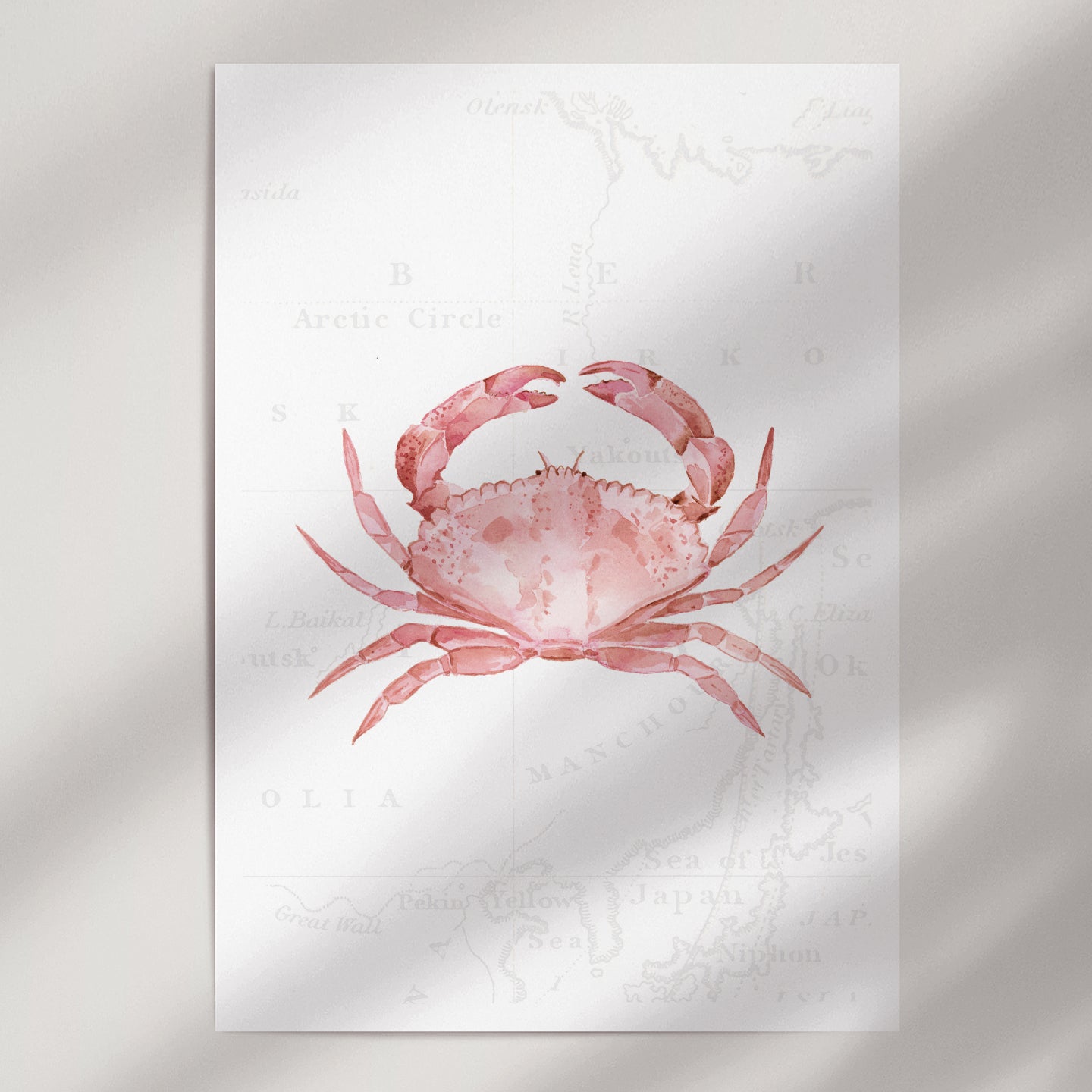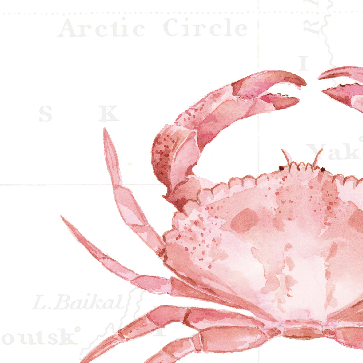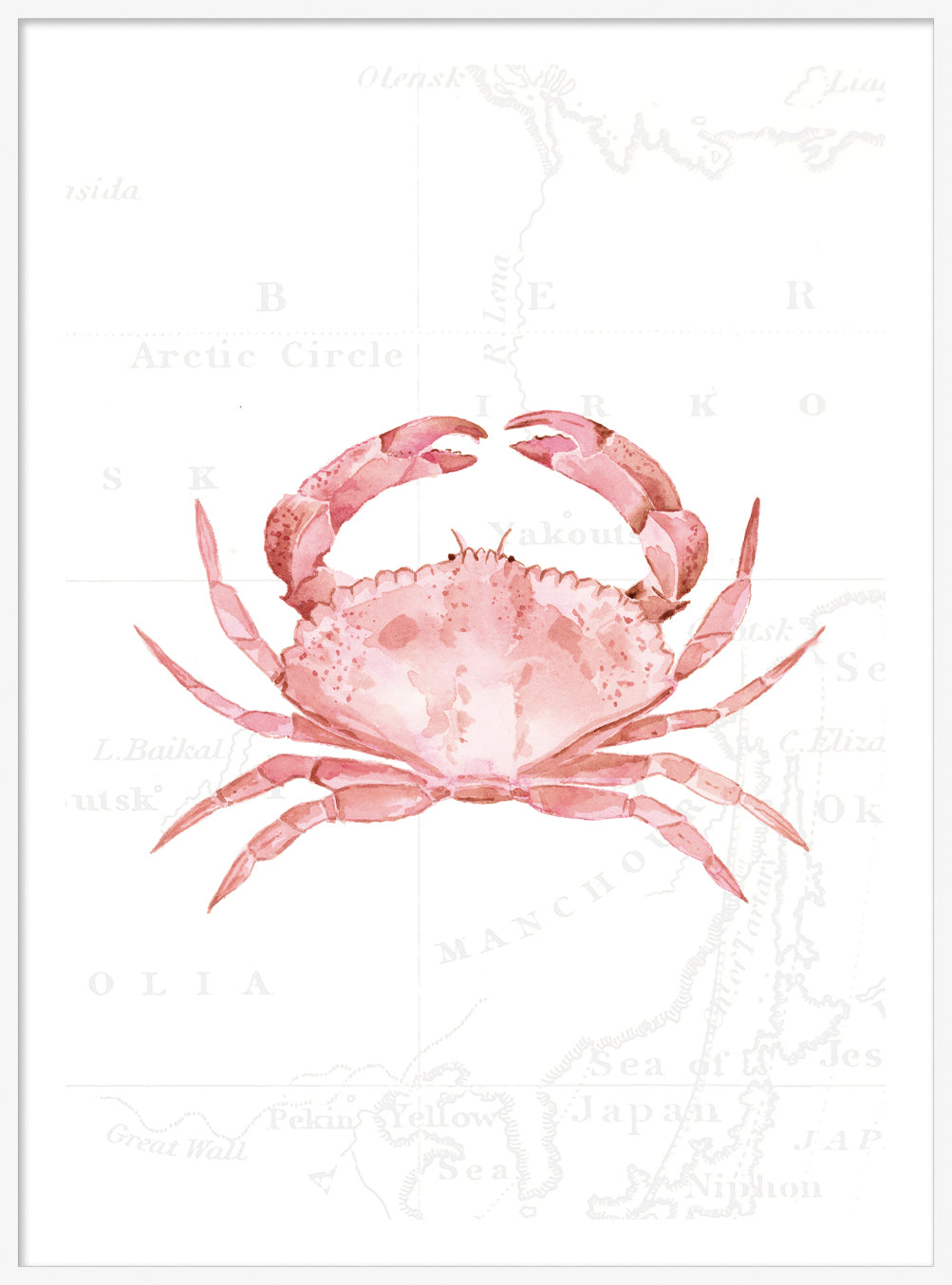 For the daydreamers and shoreline explorers - this gorgeous piece depicts a pink crab, hand painted in delicate watercolours against soft vintage map detailing.