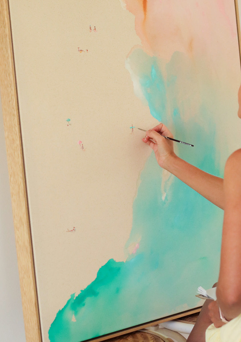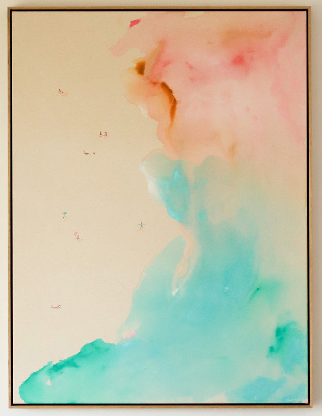 This original piece is inspired by the vast, open ocean and the gentle rhythm of the sea. Featuring quiet moments of beachgoers at ease, each piece evokes a sense of calm and stillness, capturing the peaceful essence of sunlit coastal days.
