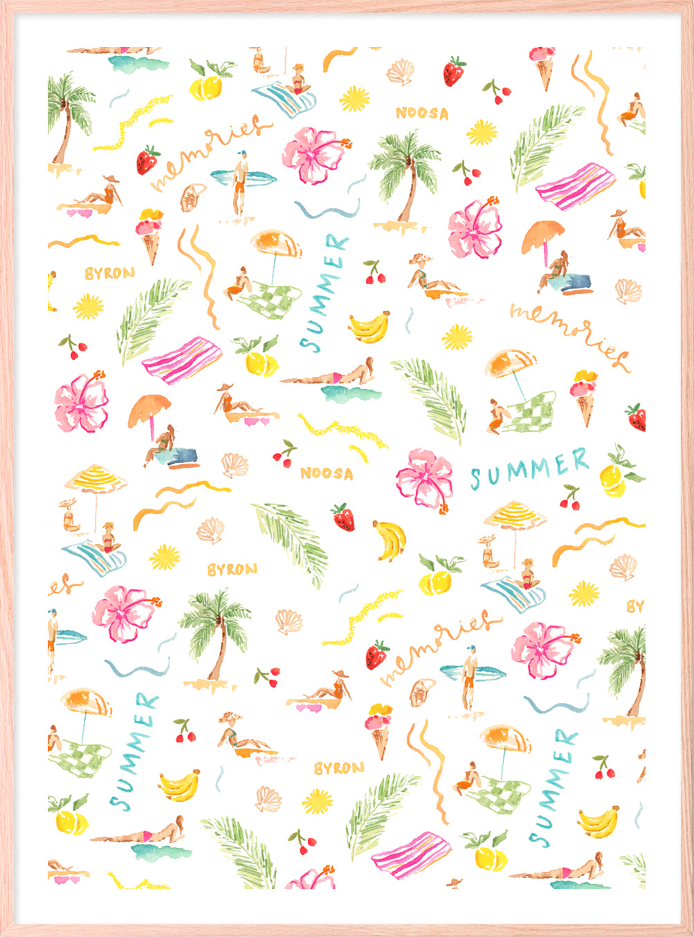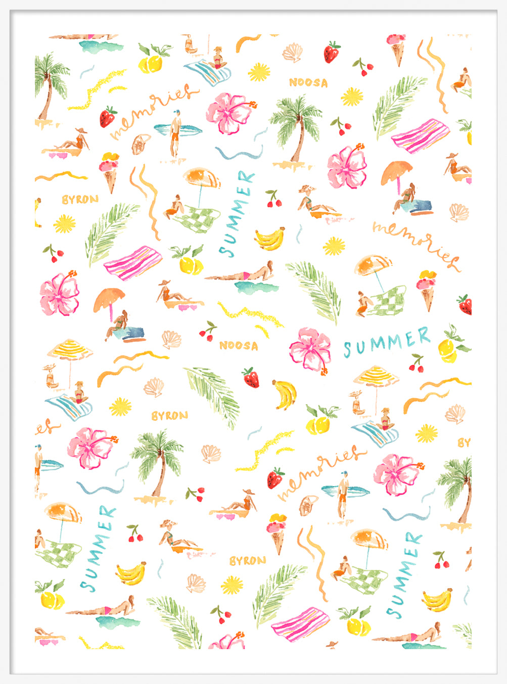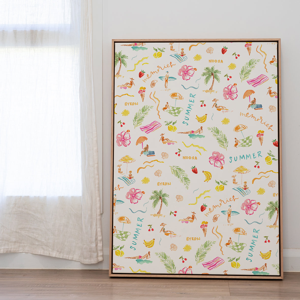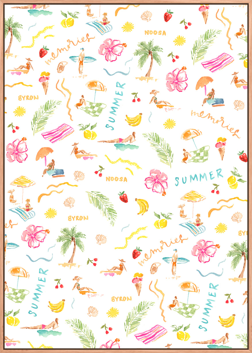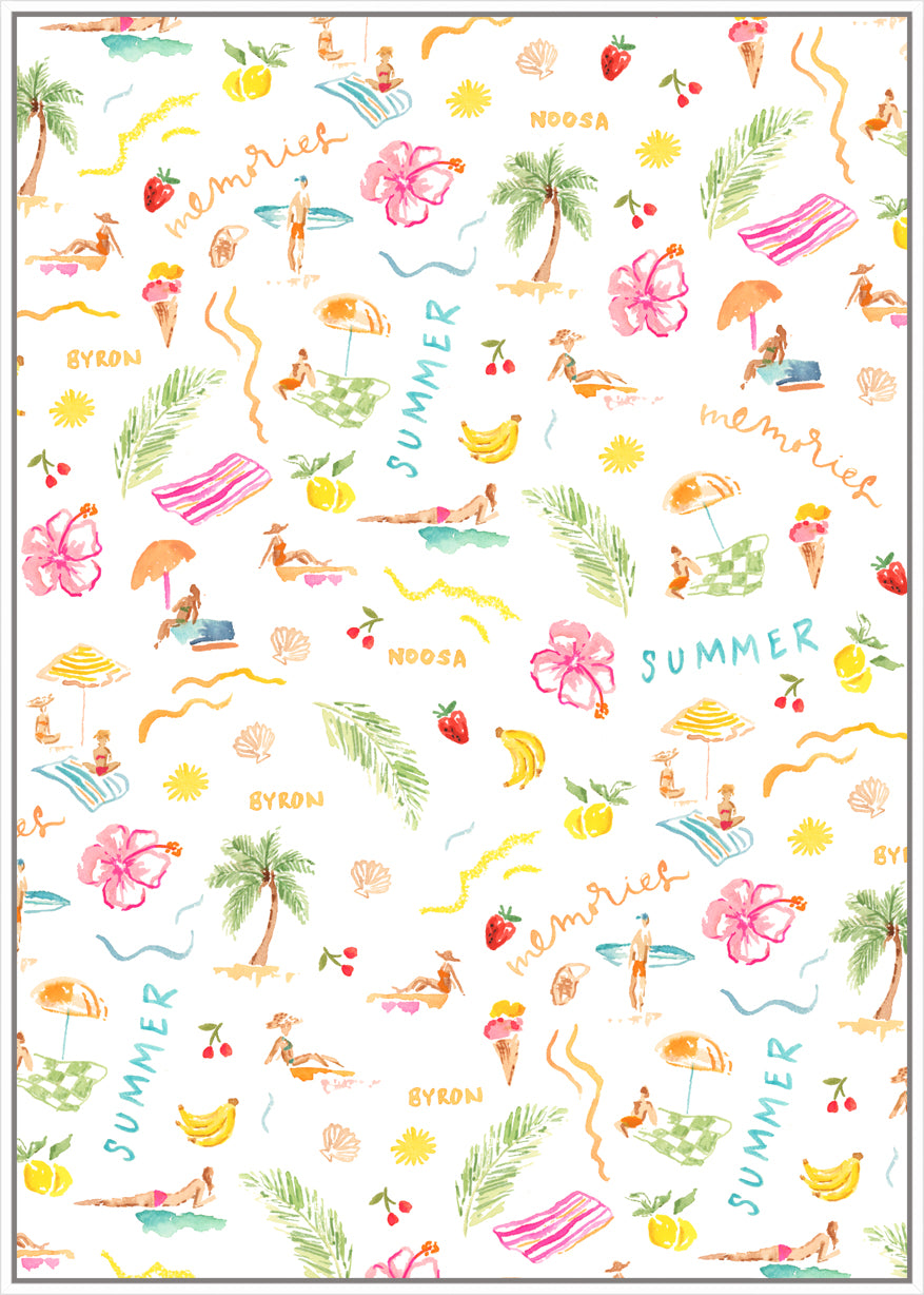 Iconic Noosa beach style, 'Summer' captures the vibrant, carefree weekends spent on the coast in a playful, joy infused palette. This piece evokes visions of colourful beach towels, a sea of umbrellas, surfboards, ice-cream, salty skin and perpetually sandy feet.